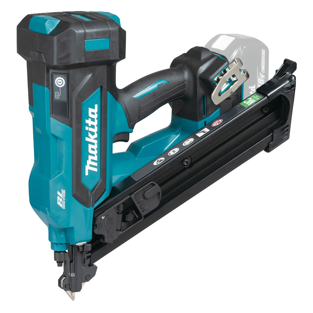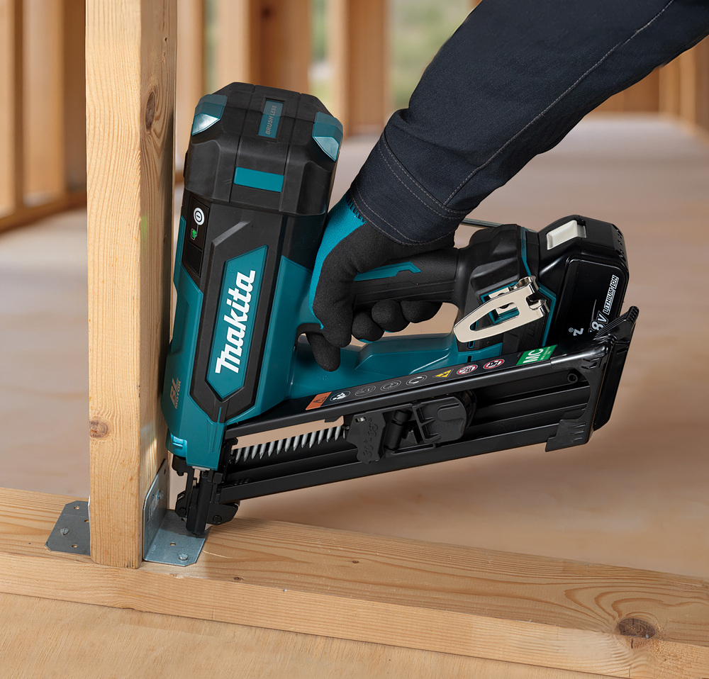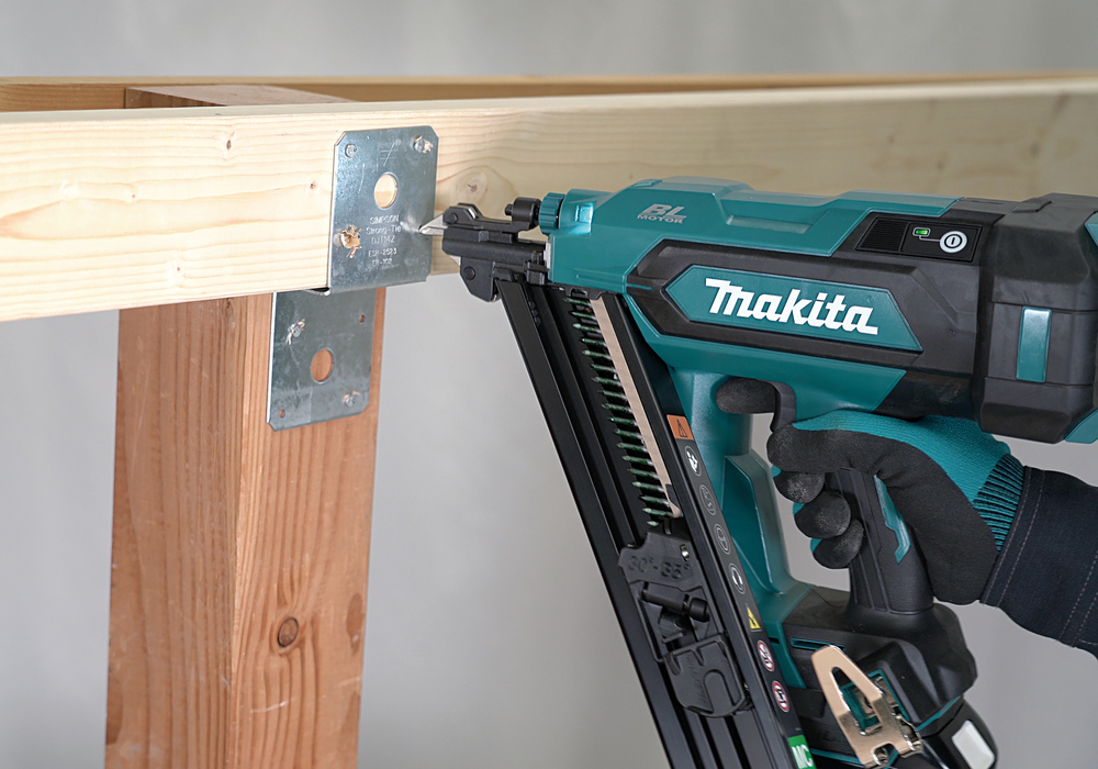 Le design du nez fin facilite la visée dans les trous des connecteurs métalliques utilisés aux joints poutre-colonne, permettant un clouage précis des coins. Moteur BL haute puissance et ressort pneumatique avec une capacité de clous jusqu'à 64 mm. Mécanisme anti-déclenchement à vide lorsque les clous restants sont de 4 à 5. Technologie XPT.